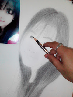 มาถึงตรงนี้เป็นการใช้ดินสอที่มีความเข้มมากๆหน่อยลงความเข้มตรงตาอีกครั้งเพื่อเพิ่มความดำของตาดำและลงความเข้มในส่วนของเส้นผมให้ดำขึ้นและลงความเข้มของเส้นผมตรงใต้คางที่เป็นเงาให้เข้มขึ้นอีกจะเห็นว่าผมจะพยามยามทำในส่วนของเส้นผมและตาให้เสร็จไปพร้อมๆกันเนื่องจากเป็นส่วนที่เข้มและดำที่สุดครับผม